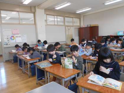 掃除の後は読書タイムです。図書室で借りてきた本や国語の教科書を黙々と読んでいます。子供たちは、「この本おもしろかったよ」「次はどんな本を借りようかな」とつぶやいていました。