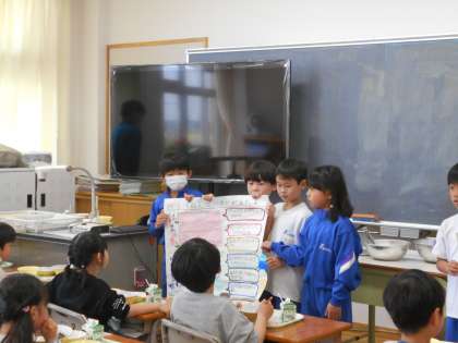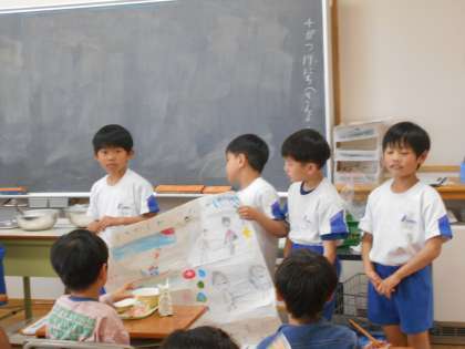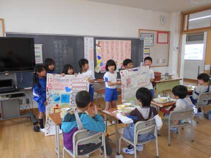 2年生は、入学してきた1年生に「こんなことがあるよカレンダー」をプレゼントしました。1年の間にする学習や行事等を大きな紙に描いて紹介しました。子供たちは、緊張しながらも、はきはきと紹介していました。