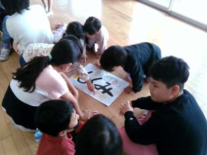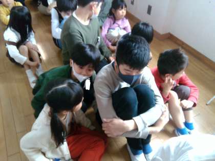 入学を祝うため、2〜6年生が集会を企画してくだいました。6年生が迎えに来てくれて体育館まで一緒に入場しました。