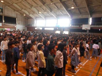 1年生入学おめでとう集会では、1年生の入学を全校のみんなででお祝いしました。2年生は、あさがおの種をプレゼントしました。また、代表の子が1年生とじゃんけんをして楽しみました。集会の最後には、全校のみんなで合唱をして、きれいな歌声が響きました。