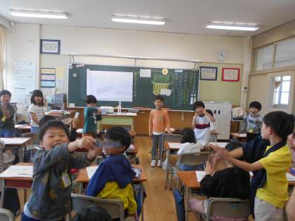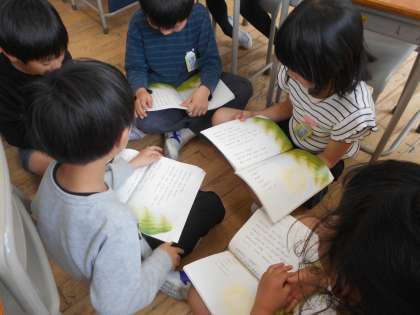 国語科「ふきのとう」の学習では、場面の様子が分かるように音読しようという目当てをもち、繰り返し練習をしています。今日は、友達の音読を聞いて感じたことを話合いました。子供たちは、友達の音読を聞いて見付けたよさを取り入れようと一生懸命でした。一人で黙々と読む子、何人かで声を合わせて読む子、2人ペアで代わりばんこで読む子等、いろいろな方法で練習をしていました。