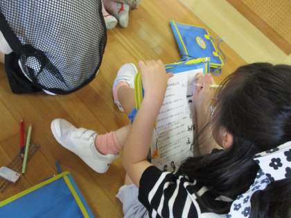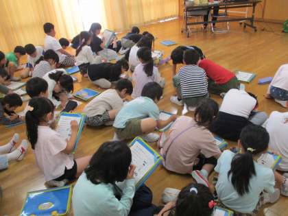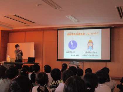 多目的室では、自転車の乗り方についてスライドのイラストを交えて教えていただき、最後はテストをしました。子供たちは学んだことを確認しながら解いていました。これからも交通ルールを守って正しく安全に自転車に乗りましょう。