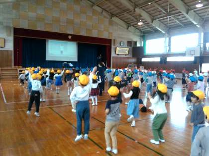 今日は1年生みんなで、運動会の準備体操で行う「きときと夢体操」の練習をしました。