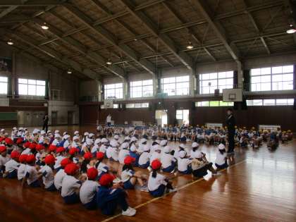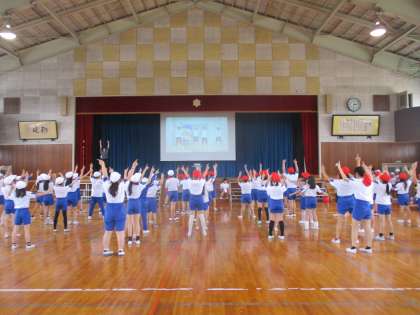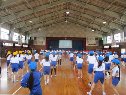 運動会で行う、きときと夢体操の動きを学年で確認しました。元気よく体を動かすことができました。