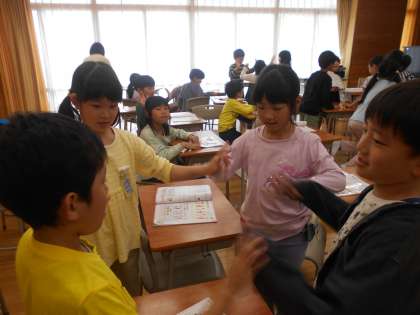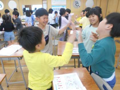 音楽科では、はくのまとまりを感じながら歌ったり踊ったりしています。今日は、三拍子の曲に乗りながら、グループの仲間と手を叩いて音楽を楽しみました。