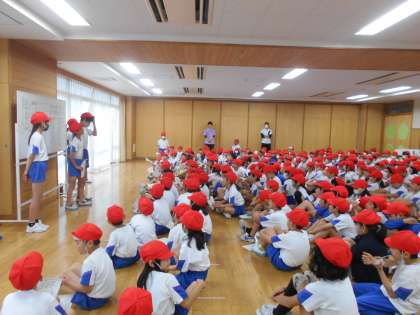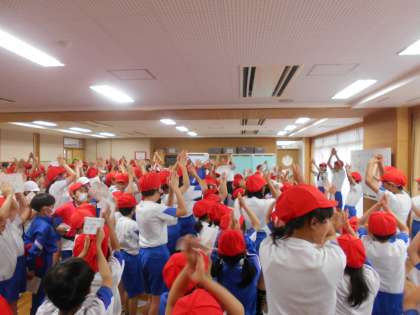 今日は、結団式でした。団のスローガンを聞いて、運動会に向けて気持ちを高めています。また、団のみんなと応援練習をしました。上級生のお手本を見て、大きな声を出して応援の練習をしました。