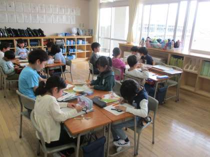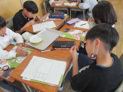 理科の学習では、植物の種の観察をしました。植物によって種の色、形、大きさが違うことや、種と成長した植物では見た目が全然違うことに気付いていました。植物の成長を観察するために、これからホウセンカとひまわりを育てていきます。楽しみですね。