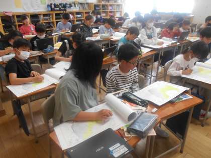 白地図を使って、富山県の地形の特徴や市町村の場所について調べました。自分たちが住んでいる地域に関心をもって積極的に活動に取り組みました。