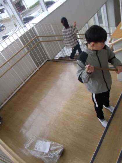 マイタイムの時間に階段を掃除する子たちに出会いました。