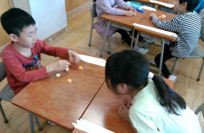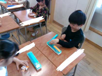算数の学習では、7や8等の数がいくつといくつでできているかを学習しています。今日は隠したブロックはいくつなのかクイズを出し合いました。