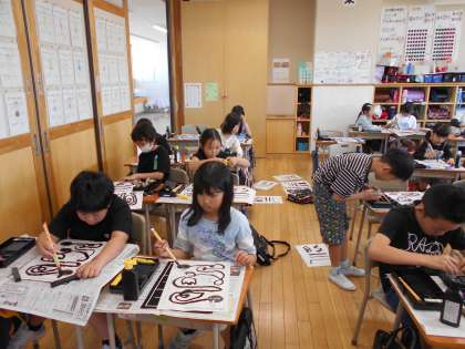 穂先を動かして字を書く感覚や筆を付ける力加減、筆運びの練習をしました。墨と筆を使って字を書く新しい学習に期待を膨らませているようでした。