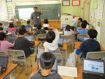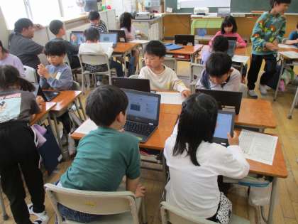 図画工作科「にぎにぎねんど」では、作った作品を写真に撮り、友達同士でよいところを見つけました。粘土を握った模様や形の面白さに気付き、クロムブックでコメントをし合いました。