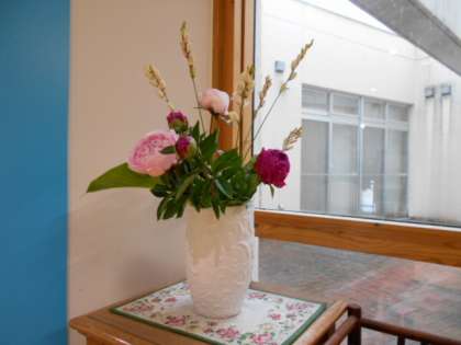 今は、シャクヤクやツツジ等がきれいに生けられています。子供たちだけでなく教職員も、花を見て「きれい」「癒やされる」等と言葉を漏らし、心に元気をもらっています。