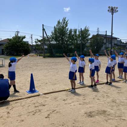 運動会に向けて、綱引きの練習をしました。入退場の練習の後に綱を引いてみました。実際に綱を引いてみることで、本番で勝ちたいという気持ちが高まっていました。