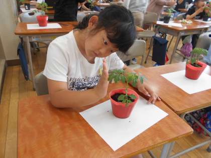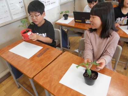 苗植えをする前に、苗をじっと観察しました。大きさや形、触った感触など、気付いたことがたくさんありました。