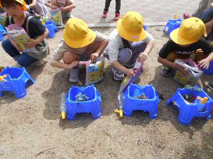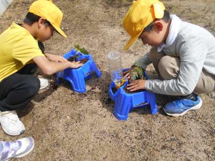外に出て、苗を植えました。植えた後は、大きく育つようにたっぷりと水やりをしました。美味しい野菜ができるといいですね。