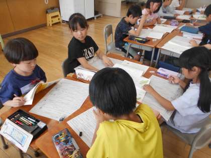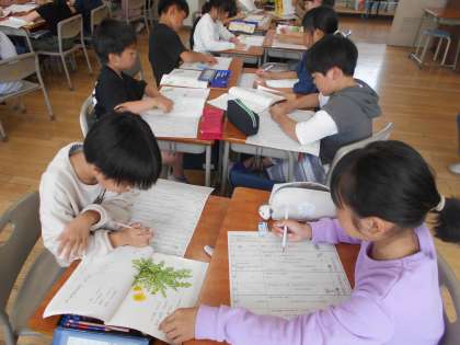 国語科では、「たんぽぽのちえ」という話を読んでいます。今日は、グループの仲間と協力して、たんぽぽの「ちえ」を探しました。