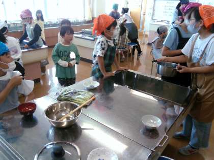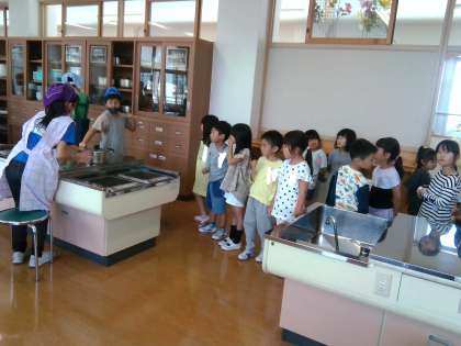 生活科の学習で学校探検をしました。家庭科室では、5年生の調理実習が行われていました。どんなものがあるか、どんな勉強をしているかを真剣に見る子供たちの姿が見られました。