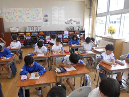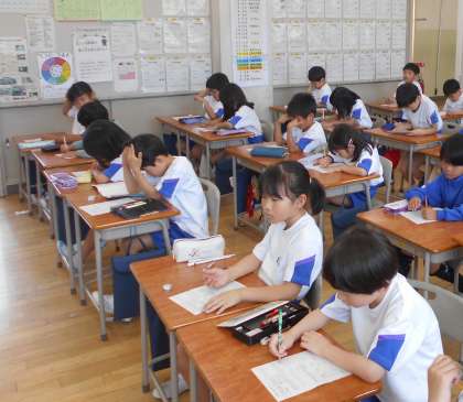 算数科「ひきざんのひっさん」では、くり下がりのある引き算の筆算の練習をしています。何度も練習して、「ノーミス まんてん」を目指しています。集中して取り組んでいます。