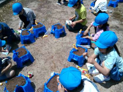 生活科の学習でアサガオの種を植えました。どんな花を咲かせるか考えながら、愛情を込めて植えている子供たちでした。