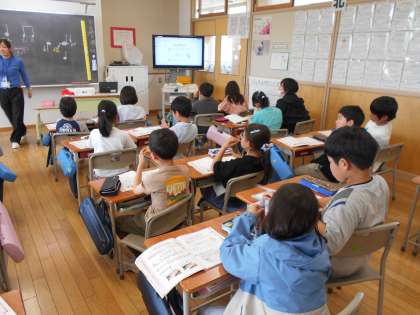 音楽科では、リズムや音の反復について学習しました。歌に合わせて手拍子をしたり、音符を見て「高さが違っても形が同じ」「線が上にいっている」といった音符で表すよさに気付いたりするなど子供たちは学習を楽しんでいました。、