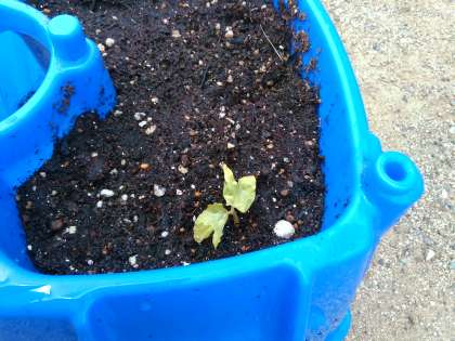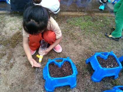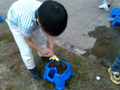 アサガオの様子を見に行った子供たちが出始めた芽を見付けました。毎日、水やり等のお世話を頑張っている子供たちはとても嬉しそうに眺めていました。
