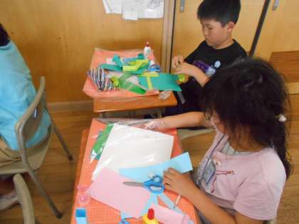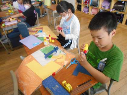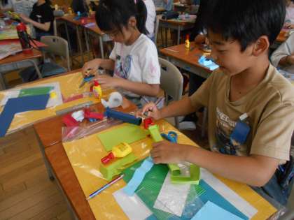 図工の学習では、ビー玉が転がる仕組みを使って、カラフルで大きな立体迷路を作っています。この日は、ビー玉が通る道の形や色を考えながら作業を進めていました。