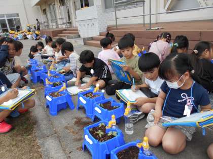 生活科の学習でアサガオの芽の観察をしました。どんな形や色をしているのかをよく見て、観察カードに描きました。