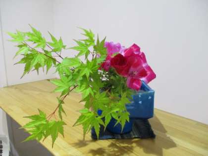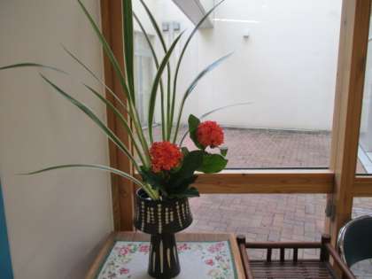 いつもお花を生けてくださる松岡さんが、今日も新しいお花を生けに来てくださいました。「明日の運動会に子供たちががんばれるお花にしましたよ」とおっしゃって明るいお花を生けてくださいました。あじさいに似たオレンジのお花は「サンタンカ」という名前だそうです。