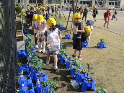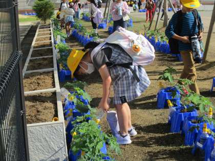 運動会の当日の朝も、子供たちは自分の野菜に水やりをしていました。とてもよい天気だったので、たっぷりと水が必要だったことでしょう。お世話をすることが、毎日の習慣となっていて素敵でした。