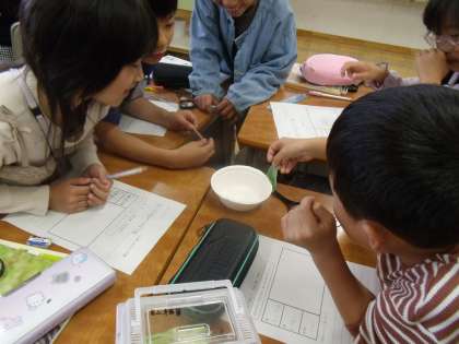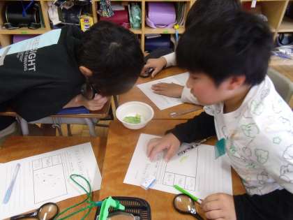理科の学習では、モンシロチョウの幼虫を観察しました。虫眼鏡で観察して、毛が生えていることや、黄色の斑点があることに気付いていました。