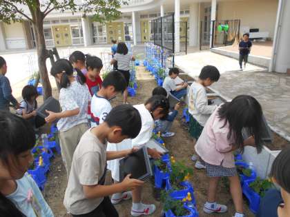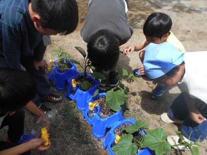 苗を植えてから二週間ほど経ちました。植える前の苗の写真と比べると、ぐんぐん大きく育っていることが分かりました。また、子供たちは「少しふくらんでいるから、実がなるのかもしれない!」「虫がいる。食べられないようにしなきゃ」とそれぞれ課題をもって、野菜を育てています。