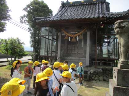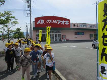 今日は小学校の南側の地域を歩いてまわりました。神社に行ったり大きな店の前を通ったりして、興味津々の子供たちでした。
