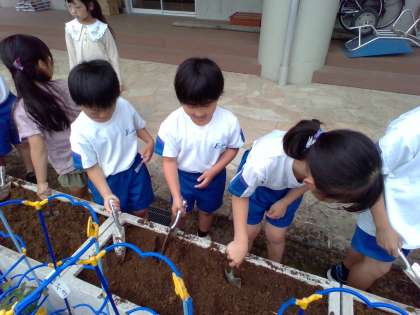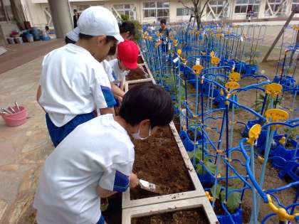 今年度は、栽培委員会の企画で、一学級につき、一つの花壇のお世話をすることになりました。来週に花の苗植えをします。今日は、苗植えの準備をしました。固くなった土を耕し、肥料をまきました。子供たちは、「ふかふかの土になった!」と大喜びでした。