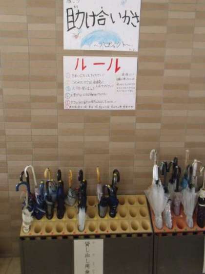 ある日、玄関の壁に「助け合い傘」と書かれた紙が貼られていました。どうやら、道徳の教科書に書かれていた取り組みに感銘を受けた5年生の子供たちがを自分たちの学校でもやってみようと動き出したようです。壁に貼られた約束や傘の一つ一つに貼られたシール等、いたるところに子供たちの工夫が見られました。