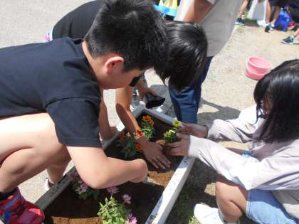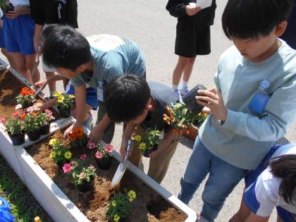 栽培委員会のお兄さんお姉さんに教えてもらいながら、花の苗を植えました。4年生が植えた花は百日草です。「カラフルで綺麗だね」という声がたくさん聞こえていました。