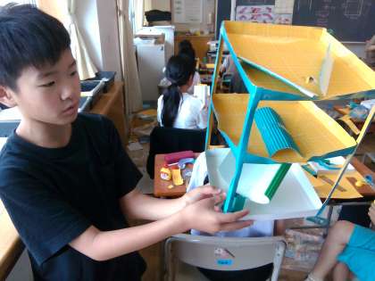 色々なコースやしかけを工夫した立体迷路「コロコロガーレ」が形になり始めました。ビー玉を転がし何回も試行錯誤しながら、楽しい作品を目指してがんばっています。