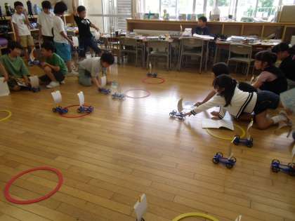 理科の学習では、風のはたらきについて調べています。今日は実際に車を下敷きなどであおいで動かして気付いたことを発表しました。「強くあおぐとたくさん動いたよ」「近くに動かすとき少ししかあおがなくても大丈夫だったよ」など、いろいろな気付きが見られました。次の授業では実際に実験で風のはたらきについて調べます。