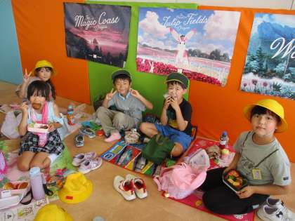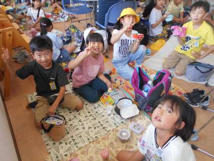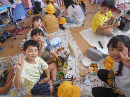 さあ、待ちに待ったお昼ごはんの時間です。今日は気温も高くなり熱中症の心配もあったため、屋内施設にてお弁当を食べました。朝早くからお弁当のご準備ありがとうございました。