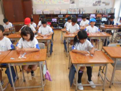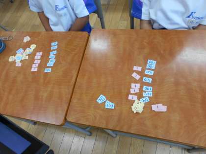 算数科の学習では、3けたの数をカードを使って表しました。百や十がいくつあるかに気を付けて3けたの数を表しました。