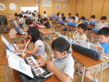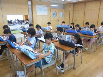 音楽科では、「ぷっかりくじら」を歌ったり鍵盤ハーモニカで演奏したりしています。この曲は、歌のメロディーのパートと、鍵盤ハーモニカのパートに分かれています。それぞれのパートの重なりを感じながら楽しく演奏しました。