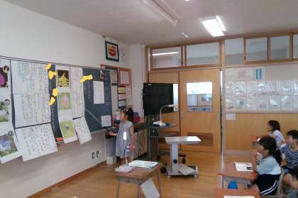 「つぼみ」の文を読み比べ、気付いたことを紹介し合いました。どの文にも問いと答えがあることや「そして」という言葉の役割について話し合いました。