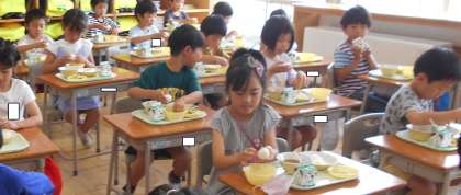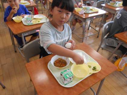 今日は、子供たちが大好きなカレーライスが出ました。ゆでたまごの殻を割り、カレーと一緒に食べるとおいしかったようです。