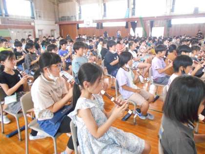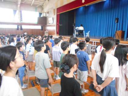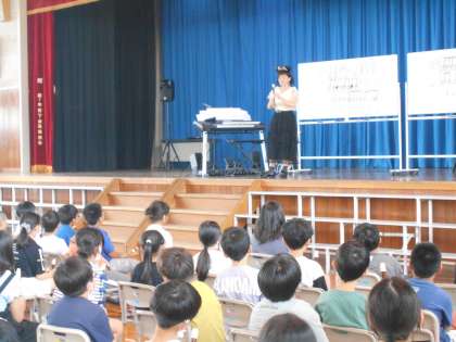 3時間目に音楽コンサートがありました。エレクトーンや鍵盤ハーモニカによる演奏を聴き、みんなで校歌を歌ったりリコーダーで演奏したりもしました。エレクトーンの音色を初めて聴くという子も多く、楽しみながらコンサートに参加していました。