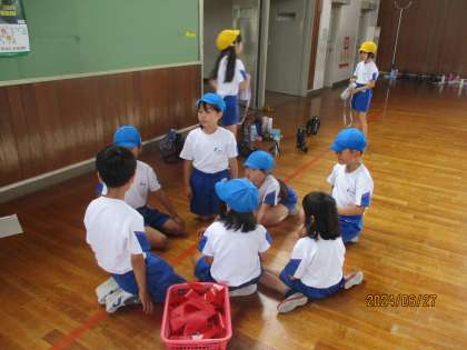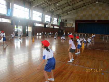 体育科では、宝運び鬼をしました。どう工夫したらたくさん得点が取れるか、また相手チームからの得点を防ぐことができるか、作戦を立てながら取り組みました。