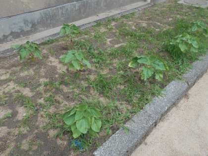 学年花壇に植えてあるひまわりがすくすくと育っています。早くひまわり畑になってほしいです。