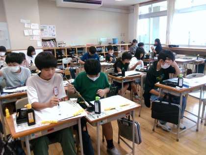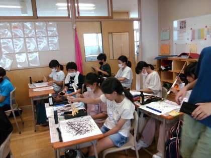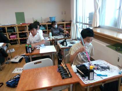 習字の筆だけでなく、図画工作科でつくった「おもしろ筆」も使い、楽しみながら作品を仕上げていました。