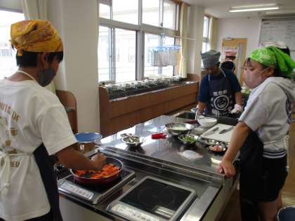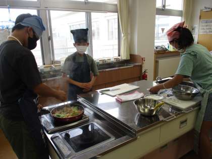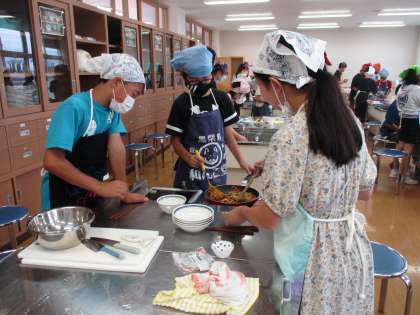 家庭科の学習で「いろどりいため」をつくりました。班のみんなと協力して、安全に気を付けながら、調理を行っていました。