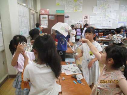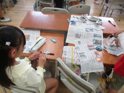 丸めたり切ったり繋いだりして、新聞紙を色々な形にして楽しみました。体にまとったり頭にかぶったりする等、新聞紙に体全体で触れながら思い付いたことを試していました。