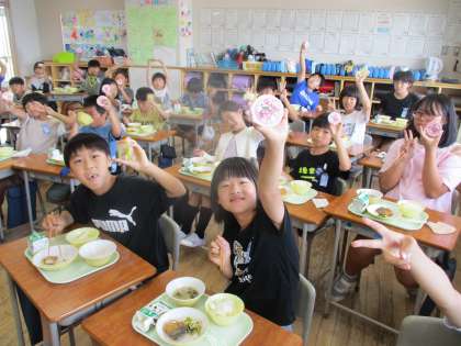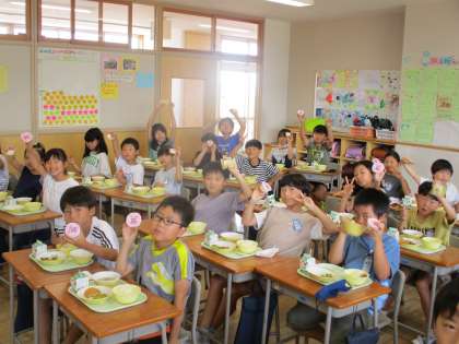暑い中、もりもり食べて元気な子供たちです。特別なデザートが出るとテンションも上がります。今年の7月もかなり暑くなりそうです。水泳学習で体を冷やしたり、しっかり水分補給をとったりしながら、元気に乗り切りたいと思います。